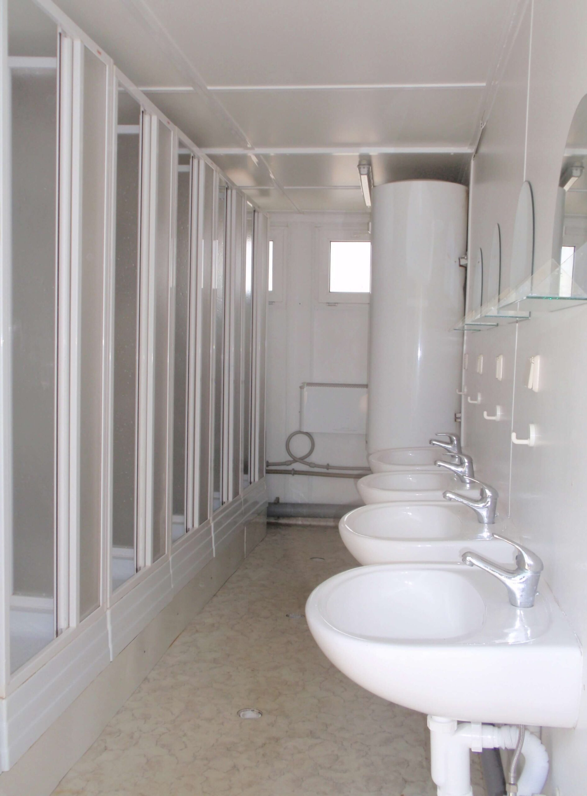 Riešenie osobnej hygieny v dámskom alebo pánskom prevedení. Kontajner je vybavený tromi sprchovými kútmi a veľkým umývacím žľabom s teplou a studenou vodou. Osvetlený, zateplený, s vykurovaním